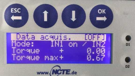 在產品進入測試之前,給IN1一個高電平3~24Vdc 的ON 信號觸發測試開始;進入扭矩測試,這里完成測試之后儀表會顯示一個峰值,顯示時間為Trigger period設置的時間;