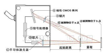 激光發射器通過鏡頭將可見紅色激光射向被測物體表面,經物體反射的激光通過接收器鏡頭,被內部的CCD線性相機接收,根據不同的距離,CCD線性相機可以在不同的角度下“看見”這個光點。根據這個角度及已知的激光和相機之間的距離,數字信號處理器就能計算出傳感器和被測物體之間的距離。