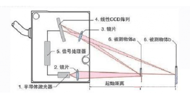 半導體激光器①被鏡片②聚焦到被測物體⑥。反射光被鏡片③收集,投射到CMOS陣列④上;信號處理器⑤通過三角函數計算陣列④上的光點位置得到距物體的距離。